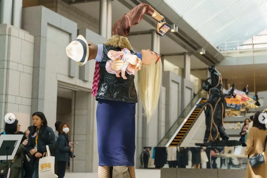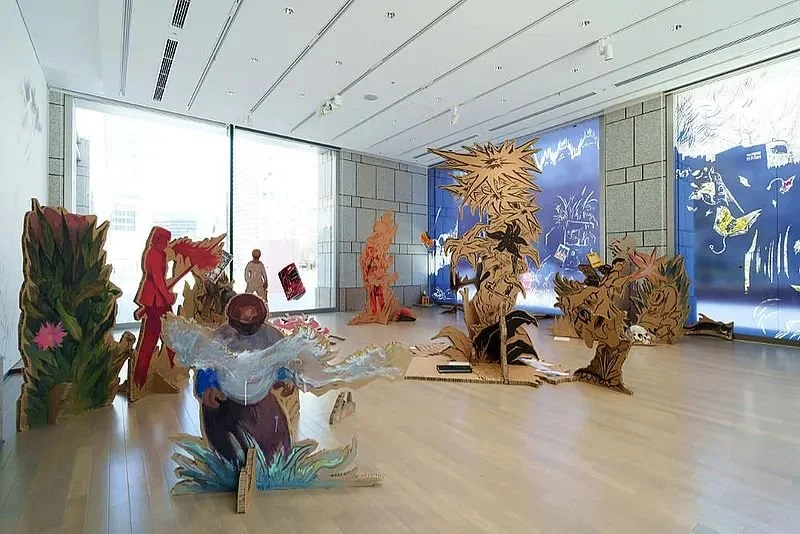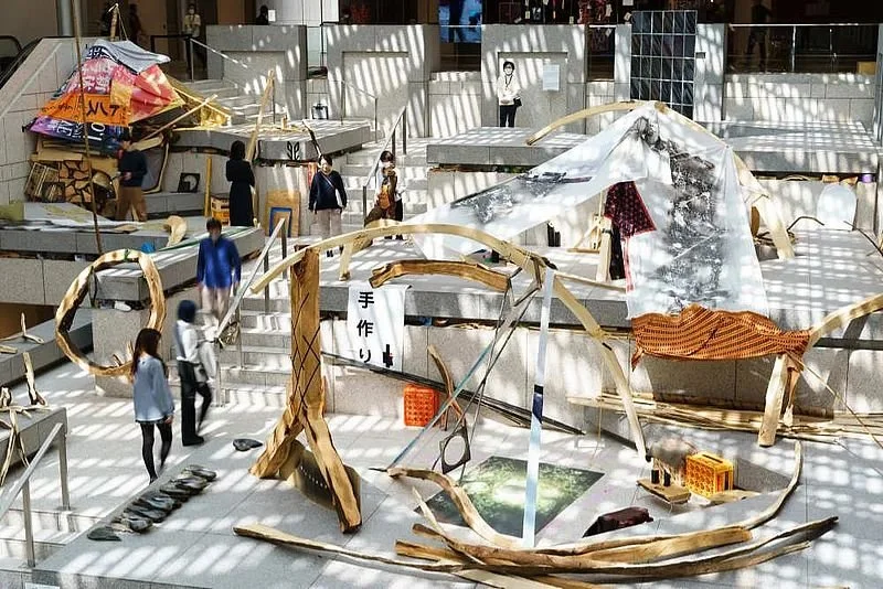 我依然记得横滨美术馆中厅台阶上 Open Group 的视频作品《跟我一起重复》,乌克兰人用口技模拟武器、飞机的声音,与战场记忆糅合在一起;另一侧埃马纽埃尔·凡德奥维尔拉的录像雕塑作品《1月6日》,记录着国会山暴乱的时刻。不曾想到 (也许也是可以预见的),展览闭幕半年之后,2025年特朗普重回总统之位,面对三年悬而未决的俄乌战场,站在俄罗斯背后,蹿升的极右势力和无力的欧盟,似乎都在证明着民主秩序的崩塌,早已在这件作品自身的影像时空中暴露无遗。美术馆的中央形成了一个更剧场化的景观:桑德拉·穆金加从天而降、幽灵般崩塌的庙宇和无力的信仰;乌孜戈·卡尔 (Ozgur Kar) 枯槁的树木横倒在地;约阿尔·南戈保留未完成状态的土著帐篷;皮帕·加纳那被解构的多面人被放置在镜面站台上。