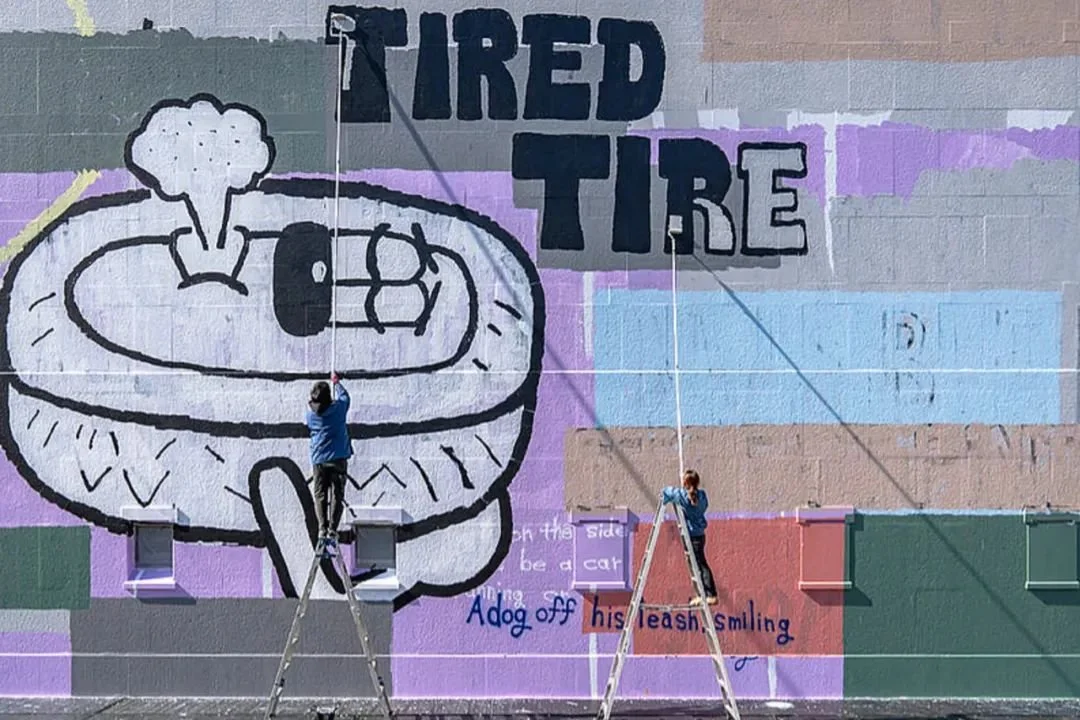 成立于2012年的日本艺术小组 SIDE CORE (高須咲恵、松下徹和西広太志) 正在制作的壁画《大字小事》(Big Letters, Small Things)。第八届横滨三年展,展览章节:“我们的生活”,展览场地:横滨美术馆室外。图片纪录:大野龙介。© Yokohama Triennale