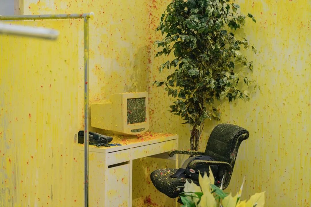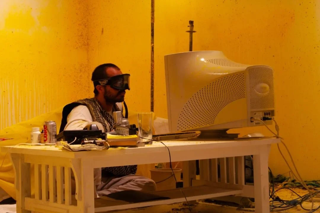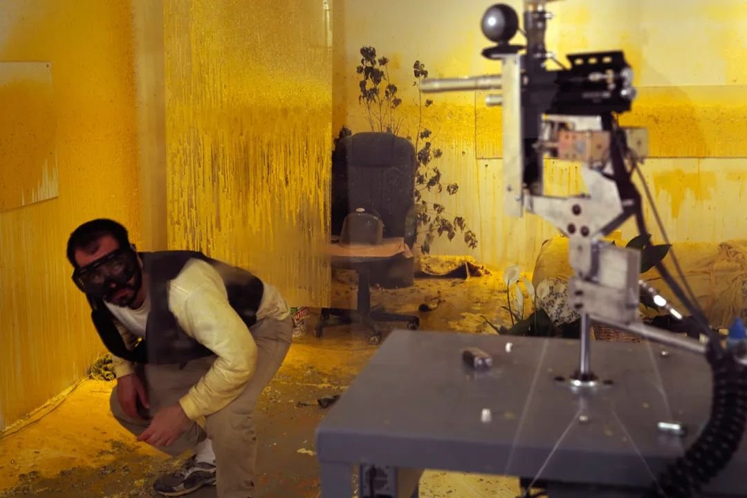 一进入展厅,第一个作品就是对2003年伊拉克战争的回顾。《国内紧张局势》(Domestic Tension)原本是比拉尔2007年在芝加哥FLATFILE 画廊为期一个月的行为艺术作品。艺术家在艺术空间中一个随时面临枪击威胁(以遥控彩弹枪模拟)的房间里住了一个月,彩弹枪可以打中房间的各个角落。一个月的时间里,观众可以从网上点击发射彩弹,并通过实时直播看到房间里的情况。彩弹枪射击时响声巨大,子弹炸开的黄色颜料染满了展墙,充满恶臭。在表演期间,比拉尔每天写日记,并进行拍摄记录。《国内紧张局势》还原了艺术家的亲兄弟哈吉(Haaji)2003年在伊拉克被美军无人机射死的事件。比拉尔提取了军用无人机的行为模式:远程空间、实时射击、随机伤害、攻击者的匿名性以及暴力的集体性。