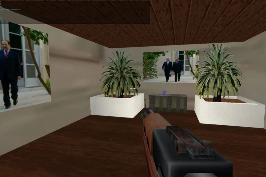 瓦法·比拉尔,《布什捕获之夜:虚拟圣战者》(The Night of Bush Capturing: Virtual Jihadi),电子游戏,2008年。图为芝加哥当代美术馆展示此游戏的“伊拉克网吧”,2025年。© Wafaa Bilal + MCA Chicago