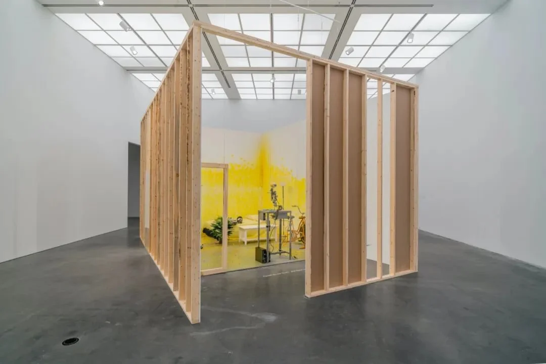 展览以新搭建的木构房间还原了2007年行为艺术的结果,可以说是“还原的还原”。它是静态的,而当年的作品是一个正在进行时的“战场”。比拉尔虽然带着头盔、护目镜等安全护具,但在一个月的时间里一直被彩弹枪射击侵扰,饱受肉体上的疼痛和精神上的折磨。来自128个国家的观众共发射了65000颗彩弹、连线聊天室里的仇恨与谩骂、对艺术家躲避射击的抱怨,呈现了对伊拉克战争、国际政治以及这次表演不同观点的争议。在这种激烈的你来我往中,观众与艺术家共同卷入了一种堪比战争的紧张关系。然而,仅静态地还原现场艺术的结果,进行档案式的复制再现,在某程度上削弱了作品的“本真性”。雅克·朗西埃认为当代艺术所应有的“邀约”(invitation/encounter)在原作中曾被成功激活,而在复制品中却被取消了。(1)观众再也无法参与作品,只能感受一下彩弹在墙上的留痕,或看看档案录像。