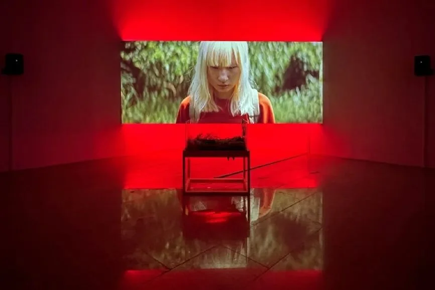 台湾艺术组合lololol(由林亭君和张欣成立于2013年)与加拿大影像艺术家利亚姆·摩根(Liam Morgan)合作的录像与声音装置作品《日月潭是一个水泥盒:重访》(Sun Moon Lake is a Concrete Box: Revisited)。济州美术馆,第四届济州双年展。© Jeju Biennale